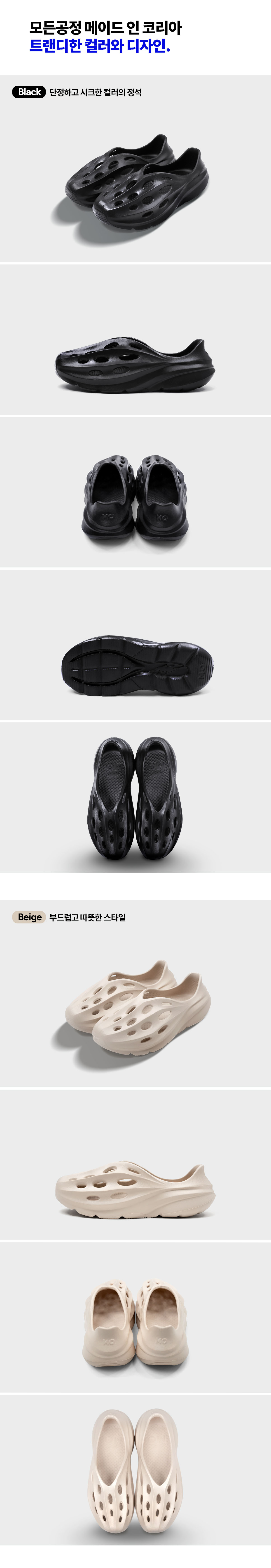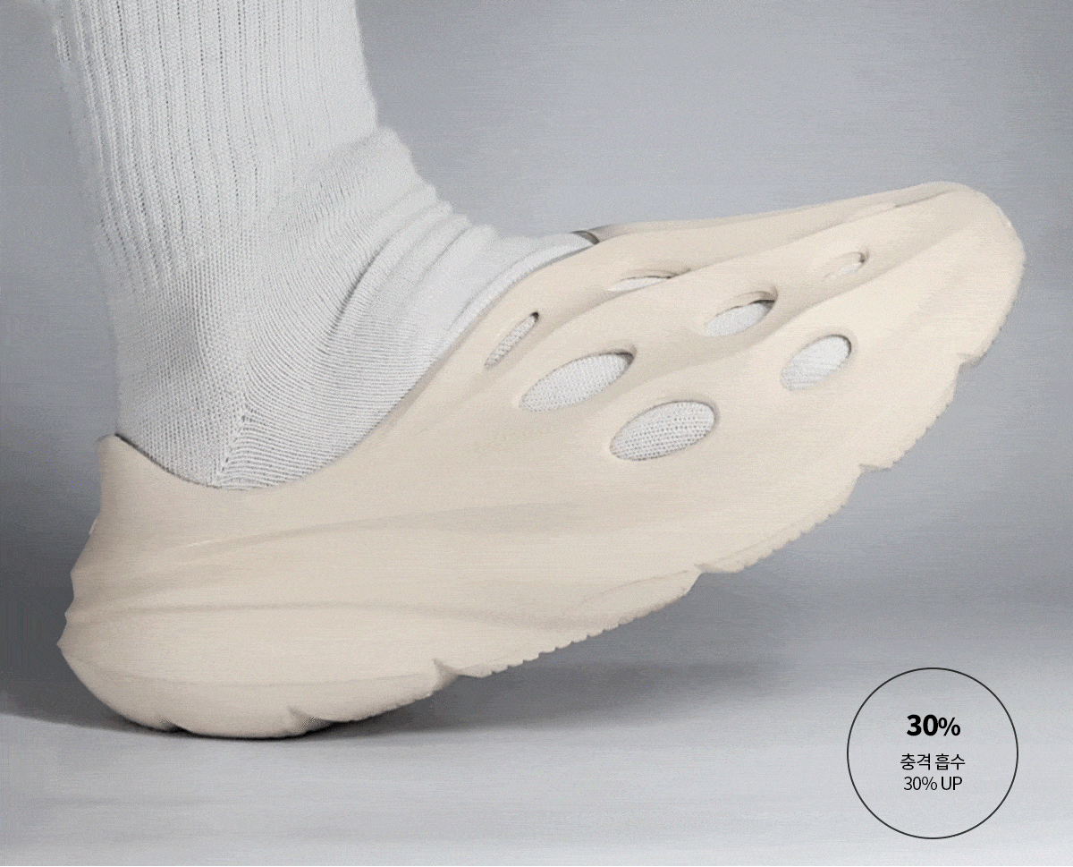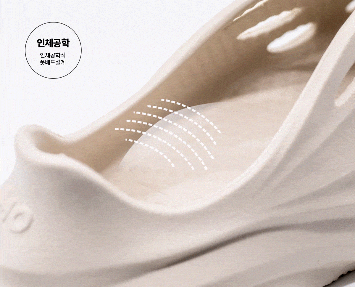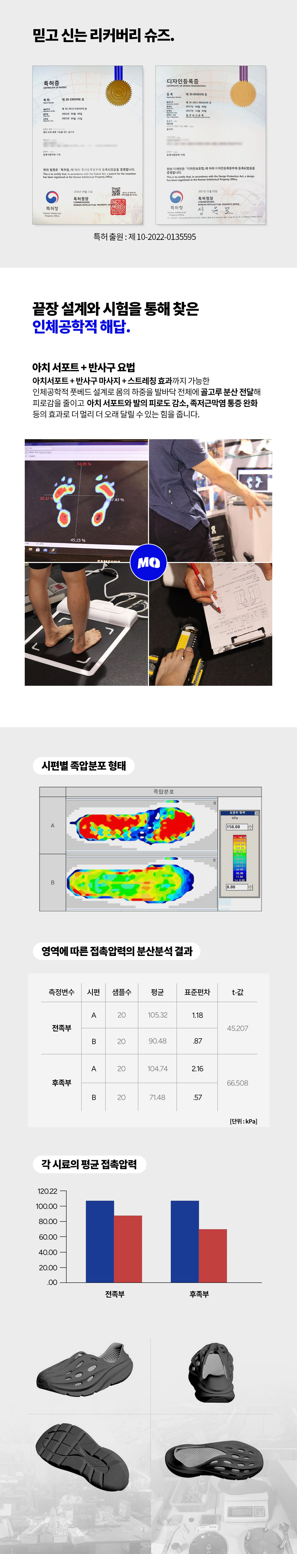 격렬한 운동 후나 오래 걸은 후, 발에 쌓인 피로를 덜어주는 역할과 동시에 발을 편하게 만들어주는 슈즈! 지면으로부터 받는 충격을 완화해주어 신고 걷는 것 만으로도 발의 피로가 회복되고 운동 전후나 일상에서 편하게 신을 수 있습니다. 충격 흡수에 초점을 맞춰 복원력 UP! 특수 배합 소재 3종 X 전문업체 협력을 통해 제품력 업그레이드! 1. 특수 기능성 폴리머 소재 3종을 황금 비율로 최적화 2. 기술 연구소 X 임가공 컴파운딩 제조 공장의 협업, 완성도 UP 3. 차별화 된 물성으로 오래 신어도 탄성미 및 충격흡수 유지 끝장 설계와 시험을 통해 찾은 인체공학적 해답! 아치서포트 + 반사구 마사지 + 스트레칭 효과까지 가능한 인체공학적 풋베드 설계 몸의 하중을 발바닥 전체에 골고루 분산 전달해 피로감을 줄일 수 있도록 설계한 디자인은 아치를 서포트 해 주고 발의 피로도 감소, 족저근막염 통증 완화 등의 효과로 더 멀리 더 오래 달릴 수 있는 힘을 줍니다.