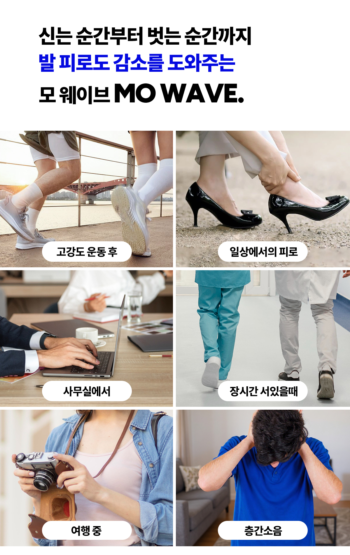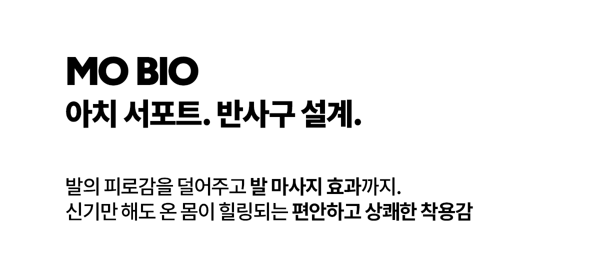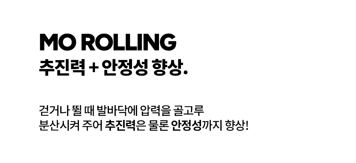 MO CUSHION 충격 흡수 쿠셔닝 30% UP 쿠셔닝 상승과 충격 흡수 후 복원력을 높여주는 컴파운드 배합 적용으로 폭신한 착용감과 발 편한 신발 MO BIO 인체공학적 아치서포트 /반사구요법 운동 후 무너진 발바닥 아치를 지지하는 인체공학적 아치서포트 풋베드 설계로 발 피로 감소 및 족저근막염 통증 완화, 신체 피로 회복 촉진 MO ROLLING 가벼운 초경량 롤링 아웃솔 발에 가해지는 압력을 균등하게 하여 보행 안정성을 높이고 추진력을 향상, 발이 편한 보행이 가능한 롤링 형태의 초경량 아웃솔 디자인 발이 받는 압력을 더욱 공평하게! 추진력 + 보행성 + 안정성 업그레이드 더욱 편안하고 가벼운 보행감을 느낄 수 있습니다.