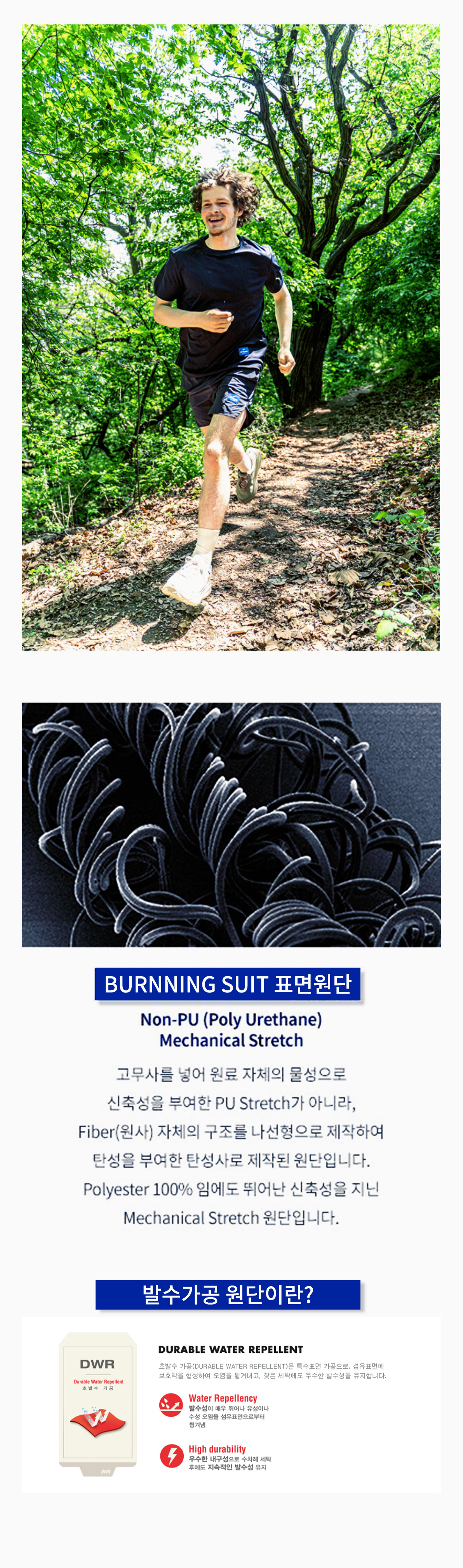 러닝 쇼츠 라인업은 메케니컬 스트레치 원단 사용과, 러닝 자세에 맞춘 입체 패턴과 발수 코팅으로,