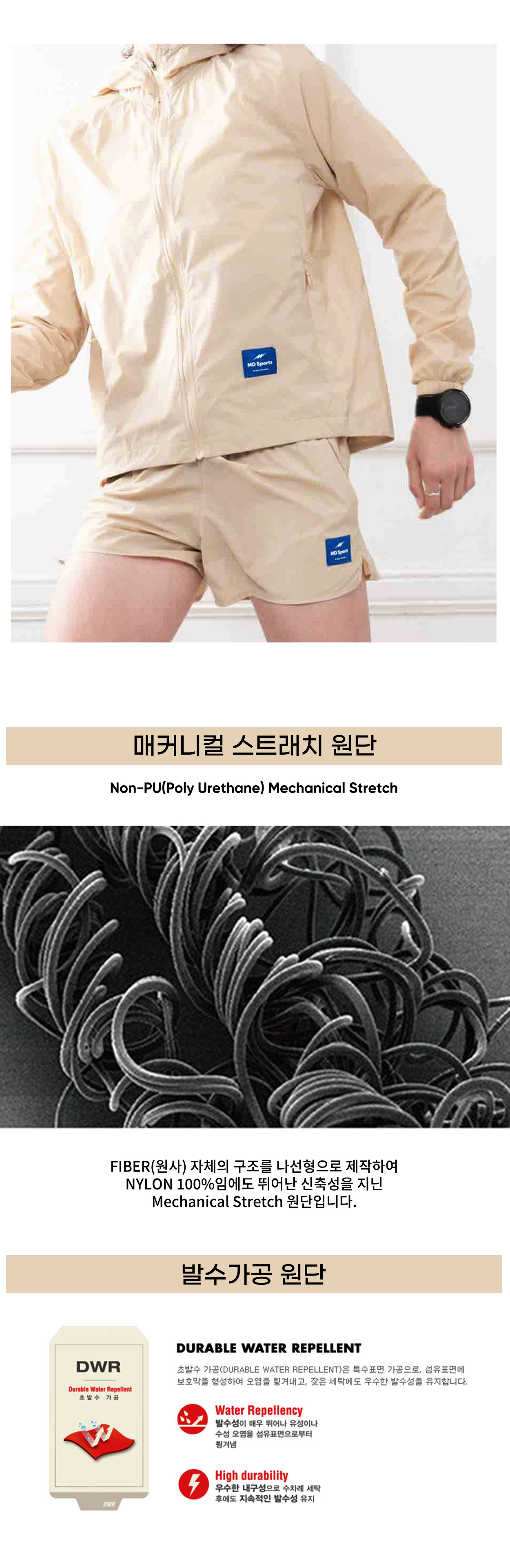 러님 윈드브레이커 라인업은 메케니컬 스트레치 원단 사용과 어닐 자세에 맞춘 입체 패턴, 그리고 발수 코팅으로 어떤 자세에서도