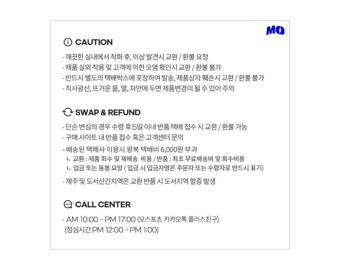 - TEL: 070-7781-1125 (물류센터 / 유선 문의 불가 / 문의는 채널톡 또는 1:1게시판 이용)