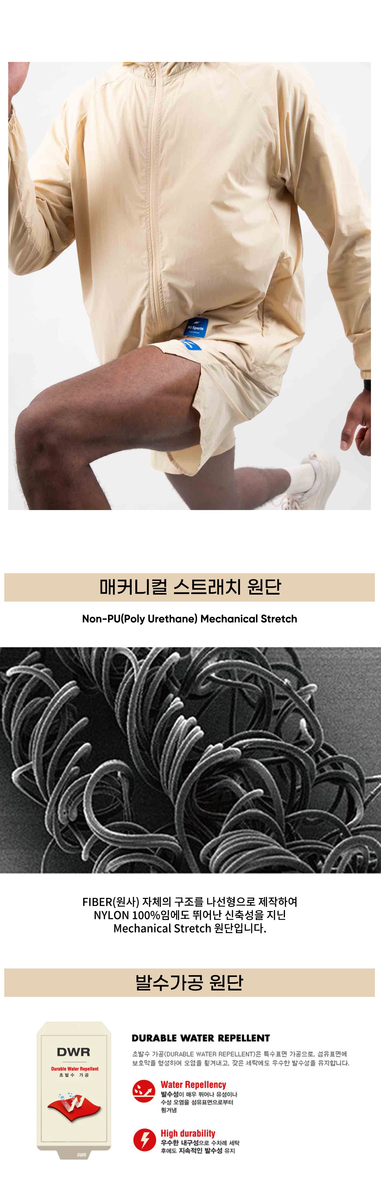 러닝 윈드브레이커 라인업은 메케니컬 스트레치 원단 사용과 어닐 자세에 맞춘 입체 패턴, 그리고 발수 코팅으로 어떤 자세에서도